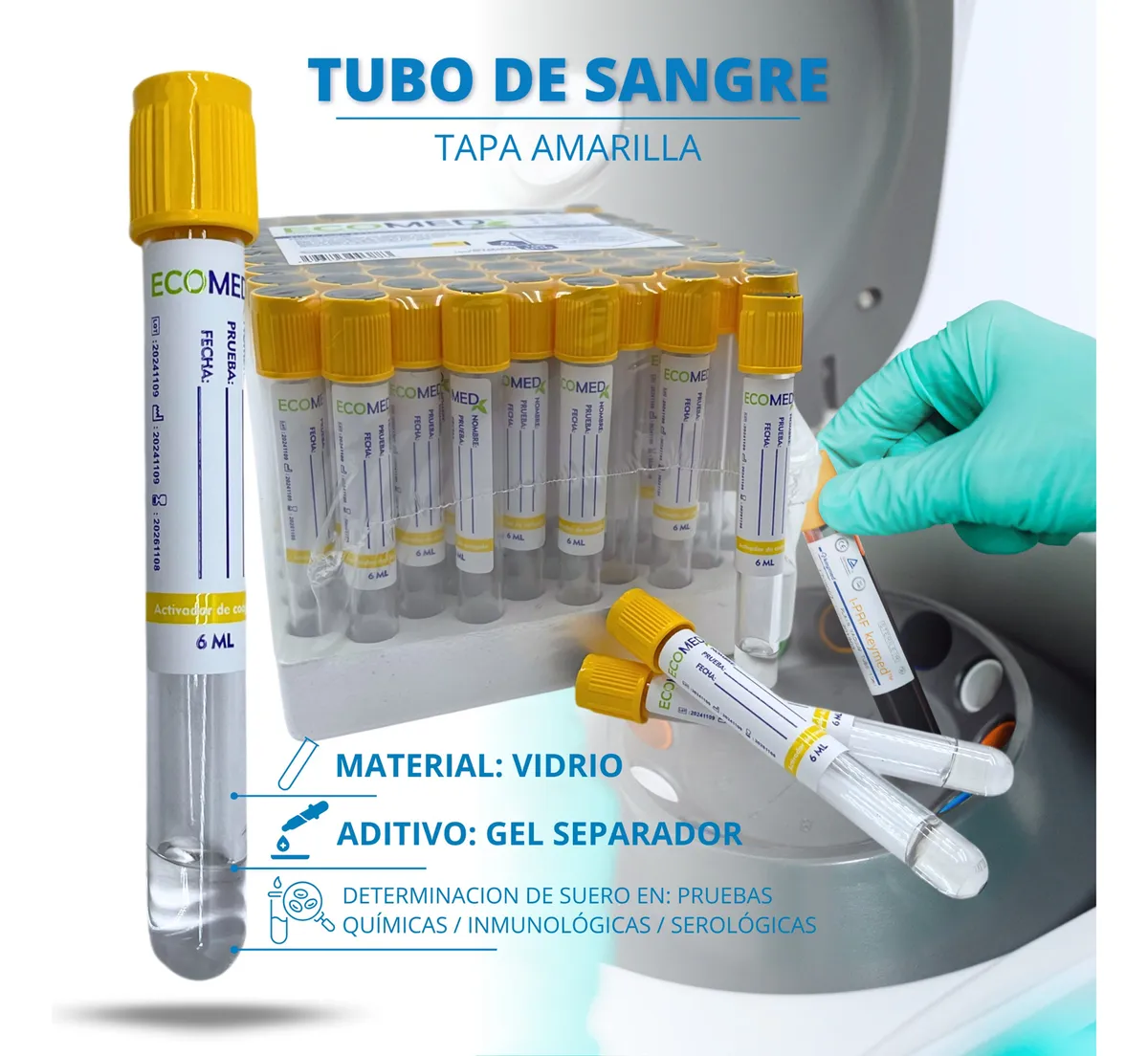 TUBO DE RECOLECCION DE SANGRE (VIDRIO) – TAPA AMARILLA – 6 ML – ECOMED – BULTO X 12 GRADILLAS (1.200 UND)